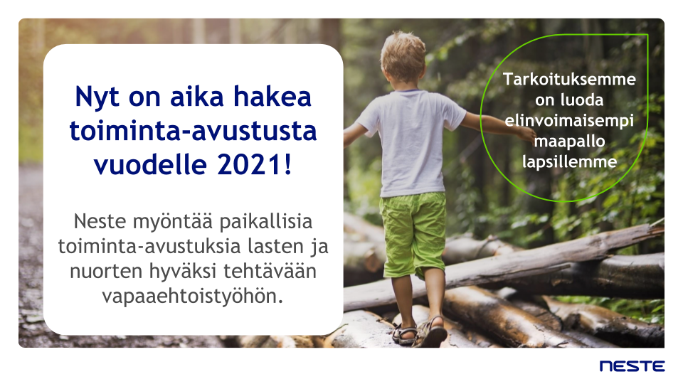 Vuoden 2021 toiminta-avustusten hakuaika on parhaillaan käynnissä. Hakemukset tulisi jättää 31.10.2020 mennessä Nesteen internet-sivuilta löytyvällä lomakkeella. Ilmoitamme hakijoille päätöksestä marraskuussa 2020.