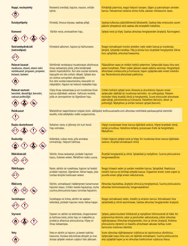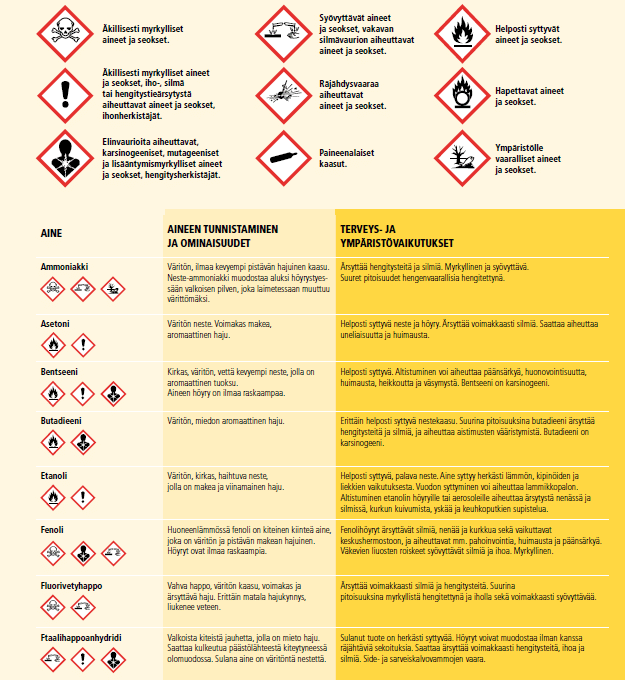 Kemikaalien varoitusmerkkien selitykset löydät täältä. Kemikaaliluettelossa kerrotaan aineen tunnistamisesta, ominaisuuksista ja sen terveys- ja ympäristövaikutuksista. Koko kemikaaliluettelo löytyy Kilpilahden yleisötiedotteesta (sivut 8-9).