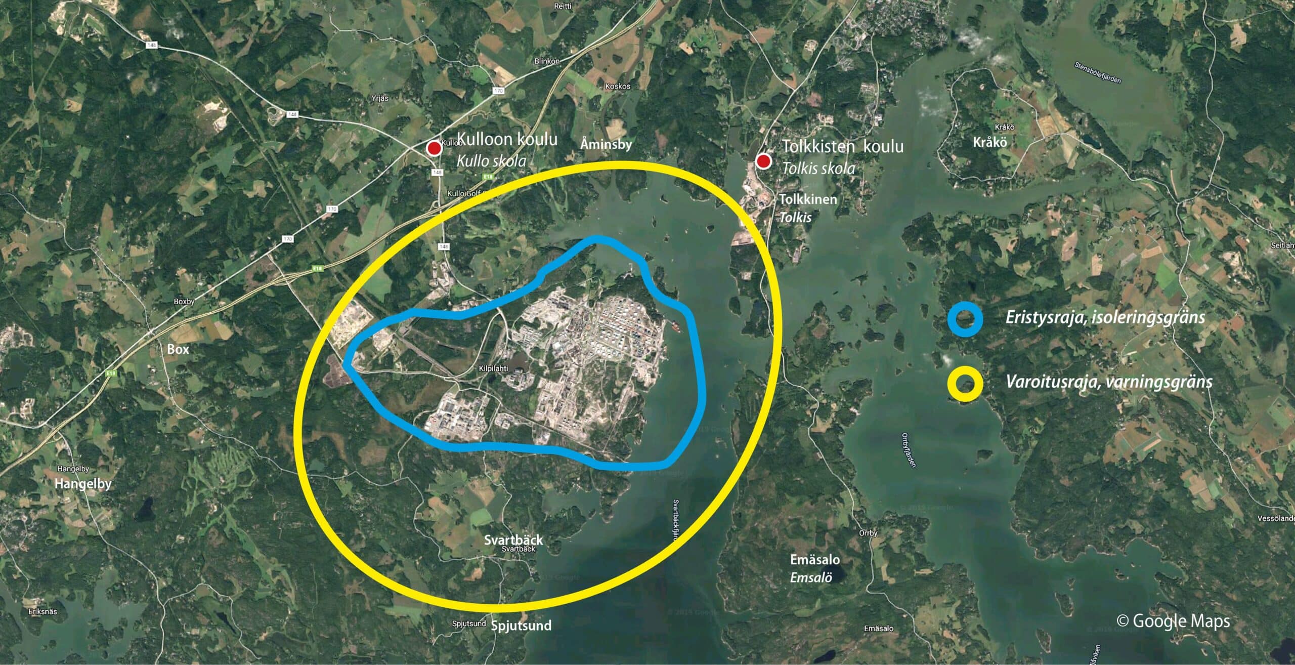 Varoitusrajalla tarkoitetaan noin kahden kilometrin etäisyydellä Kilpilahden eri teollisuuslaitoksista olevaa aluetta ja maankäytön konsultointivyöhykettä. Mahdollisen suuronnettomuuden vaikutukset (esimerkiksi hajuhaitta ja hengitysteiden ärsytys) saattavat ulottua tälle alueelle. Pelastusviranomaisen toiminta, suojelutoimenpiteenä ensisijaisesti sisälle suojautuminen ja väestön varoittaminen, perustuvat aina tilanteen mukaisiin olosuhteisiin, vaaraan ja tarpeeseen, olivatpa vaikutukset eristys tai varoitusrajalla olevalla alueella, tai näitä laajemmilla alueilla.