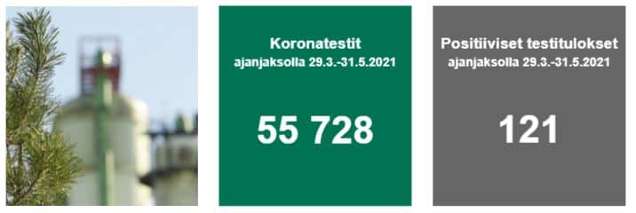 Maaliskuun lopusta koronatestejä on seisokkiin liittyen tehty yli 55 000. Positiivisia tapauksia on ollut yhteensä 121 kappaletta, joista 25 on ns. vanhoja positiivisia eli henkilö on sairastanut viruksen aikaisemmin ja testi näyttää edelleen positiivista.