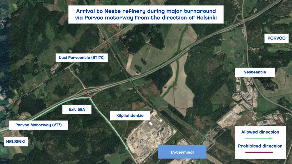 Trafiken till Neste från Helsingfors längs motorvägen (riksväg 7) styrs via avfart 58A Sköldviksvägen (karta 2). Entreprenörer som anländer med anledning av det stora driftstoppet ska ta avfarten och köra längs Sköldviksvägen i riktning söderut till det parkeringsområde avsetts för entreprenörer.