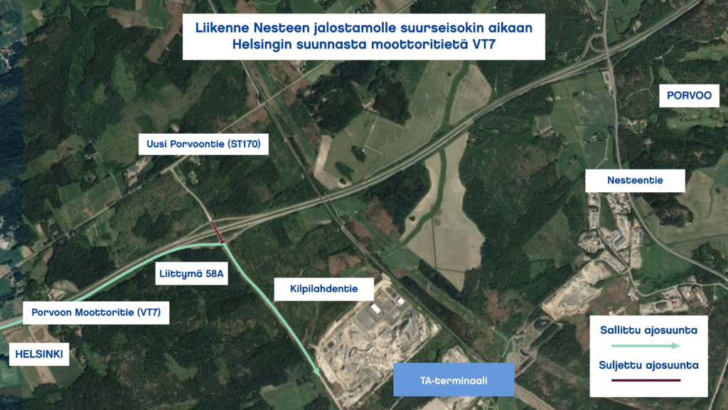 Trafik i riktningen från landsväg 170 Nya Borgåvägen/Helsingforsvägen eller från landsväg 148 Oljevägen/Nestevägen till Nestes raffinaderi