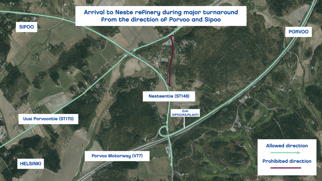 Nesteelle tieltä 170 Uusi Porvoontie/Helsingintie ja tieltä 148 Öljytie/Nesteentie kulkeva liikenne ohjataan käyttämään Nesteentien liittymää (kartta 1). Ajoyhteys tieltä MT170 Uusi Porvoontie/Helsingintie sillan yli Kilpilahdentielle jalostamon suuntaan on katkaistu suurseisokin aikana (kartta 2).
