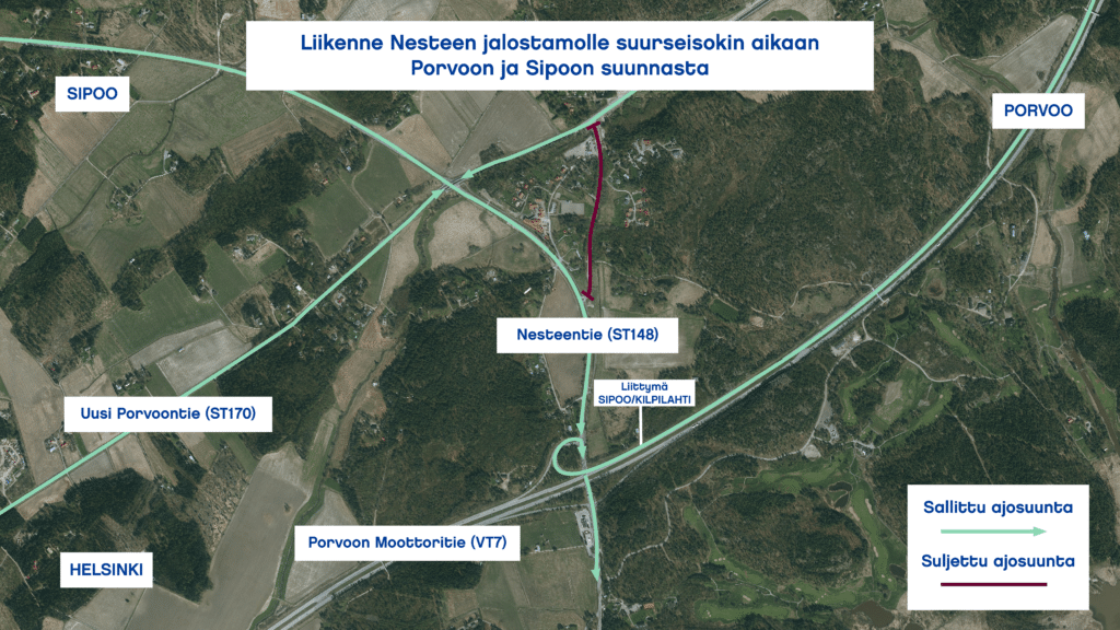 Porvoon suunnasta moottoritietä VT7 kulkeva liikenne ohjataan käyttämään Nesteentien liittymää (kartta 1). Aamuruuhkan aikaan klo 05-09 Nesteentien liikenne Nybyntien ja Kulloonlahdentien välisellä tieosuudella on yksisuuntainen suunnassa moottoritie – jalostamo. Aamuruuhkan aikaan liikenne Nesteen jalostamolta Porvoon suuntaan ohjataan poikkeuksellisesti kulkemaan Kilpilahdentien kautta. Liikenteenohjaajat ovat paikalla varmistamassa liikenteen sujuvuuden.