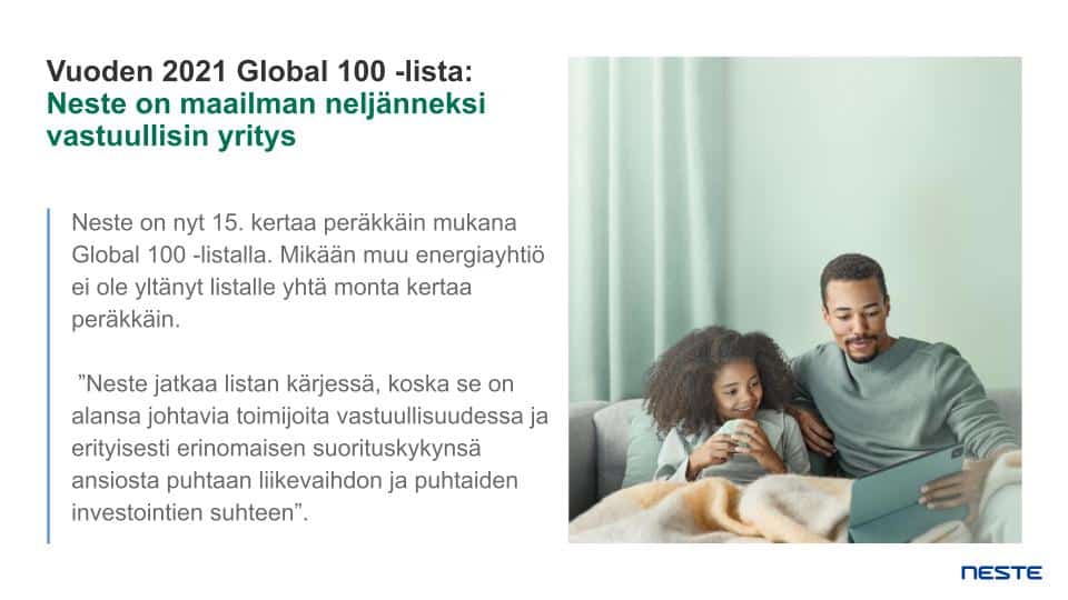 Etusivu Ajankohtaiset asiat Vuoden 2021 Global 100 -lista: Neste on maailman neljänneksi vastuullisin yritys